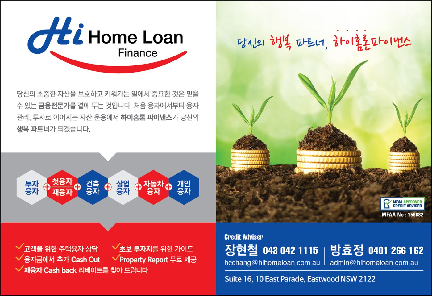 - 호주에서 가장 권위를 인정받는 융자금융전문가들의 최대 협회인 MFAA 정회원 (회원번호 156882)입니다.