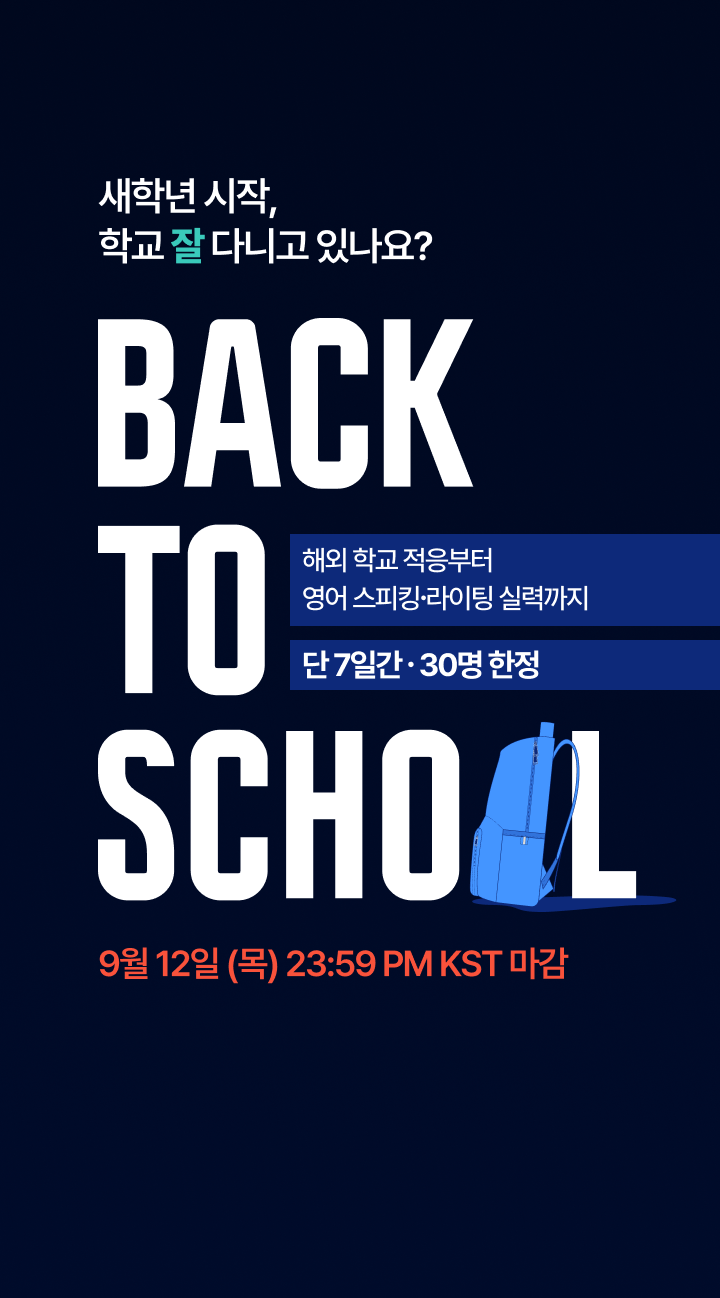 안녕하세요, 10대를 위한 화상영어 링글 틴즈팀입니다! 새학기, 해외학교 생활에 완벽히 적응하고 대비할 수 있도록 <Back to school> 이벤트를 준비했습니다. [~9/12(목)]