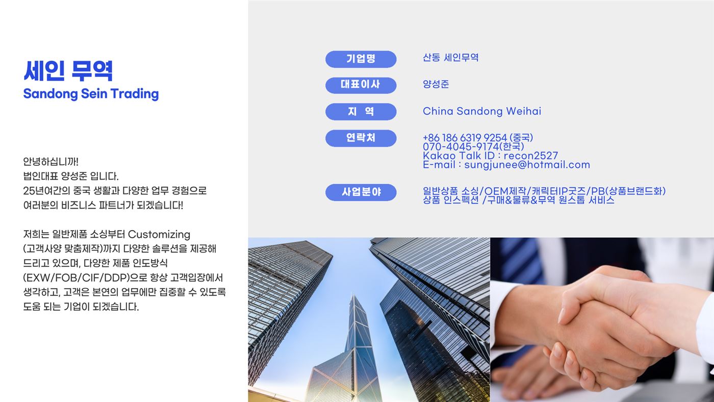 저희 회사는 중국 완제품 소싱 구매대행, OEM 제작, PB 제작을 전문으로 하고있습니다.