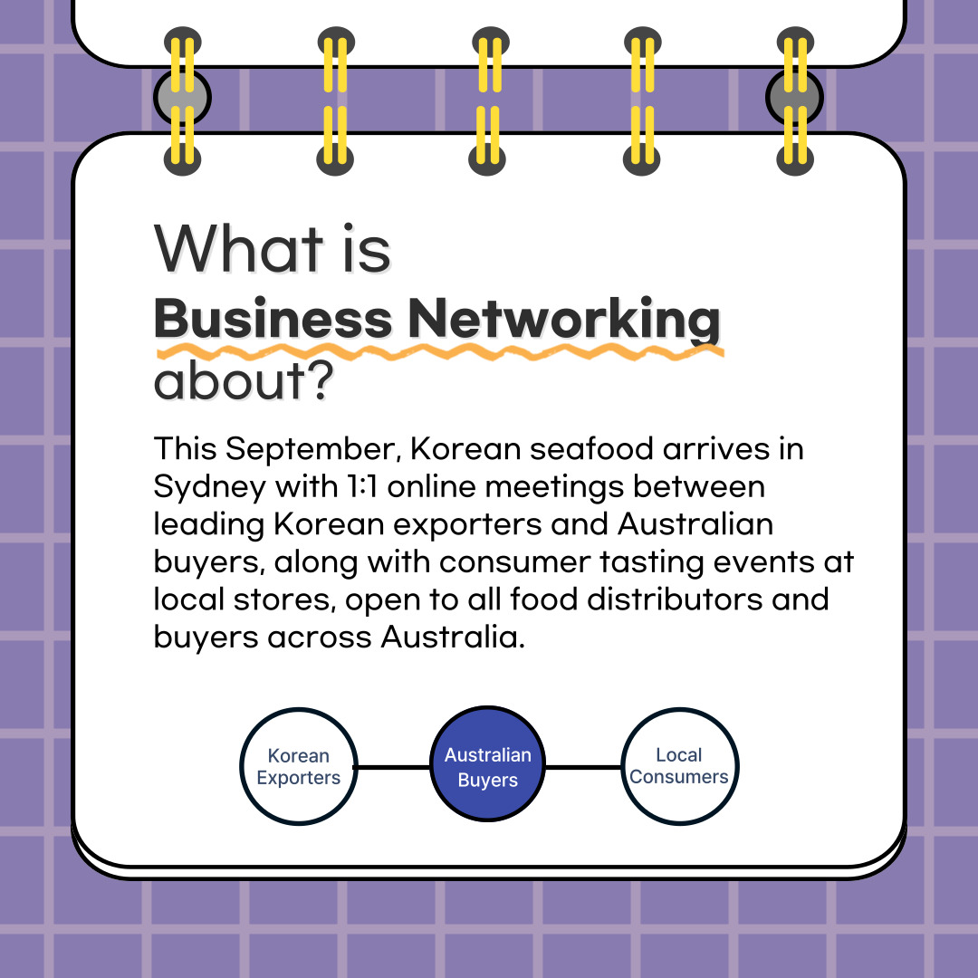 이번 행사는 한국 우수 수산물을 소개하고, 호주 유통·수입업계와 새로운 비즈니스 기회를 모색하는 자리입니다.